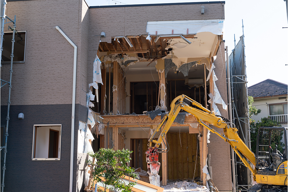 木造や鉄筋コンクリート造など、さまざまな構造物の解体工事に対応しています。戸建て住宅はもちろん、5階建て以下のマンション・商業施設・店舗・倉庫など、幅広い建築の解体を承ります。